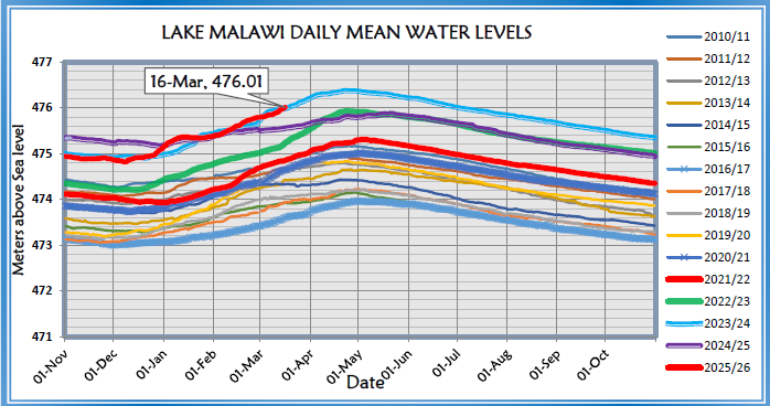 The mean Lake level, as at 16th March, 2026, was 476.01 metres above sea level (masl), against 475.55 masl recorded on the same date in in 2025, representing an increase of 0.46m (refer figure 1 below). The increase is projected to reach to around 476.4 masl in May,2026 which would be the highest in this season.
